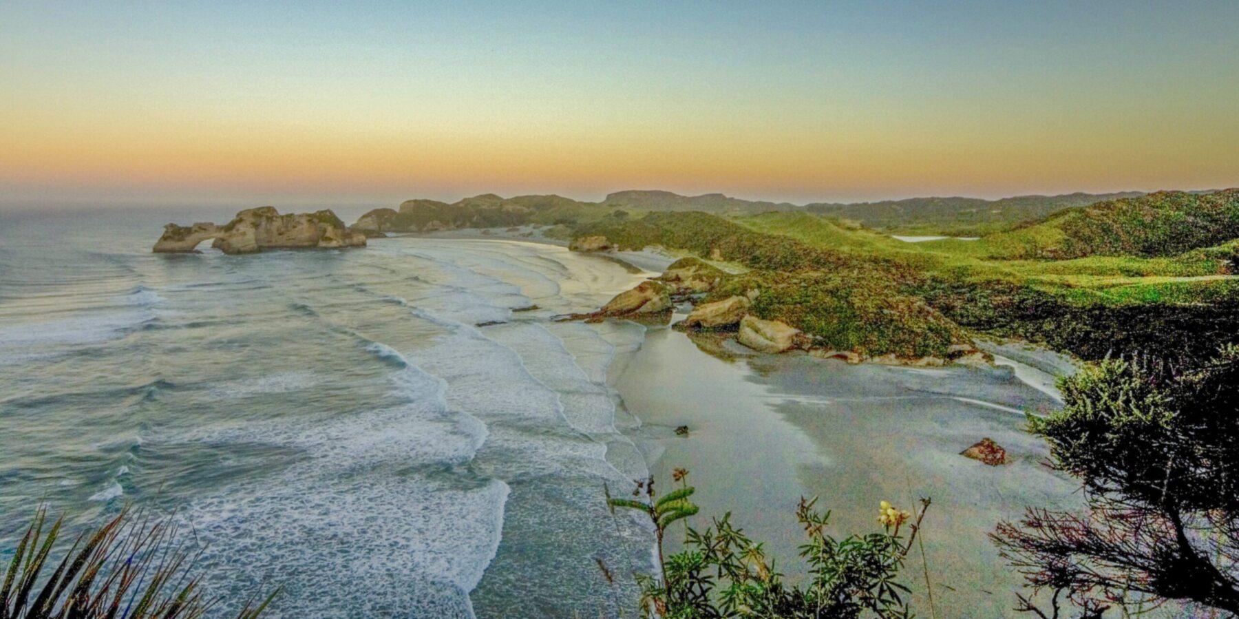 A short, scenic walk through rolling green farmland and windswept bush leads you to a vast, otherworldly expanse of sand dunes, tide pools, and towering sea-carved arches. At low tide, you might spot New Zealand fur seals playing in the pools or sunbathing on the rocks,an unforgettable experience for photographers and wildlife lovers alike.